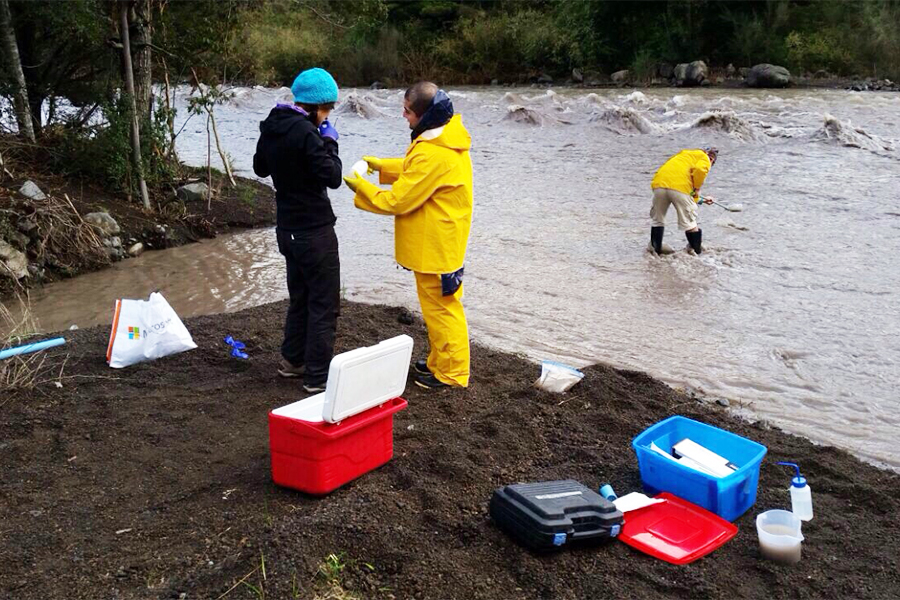 El grupo compuesto por estudiantes de pregrado y del Doctorado en Ciencias de Recursos Naturales, técnicos e investigadores, fue encabezado por el Dr. Gustavo Ciudad, quienes junto a profesionales del Ministerio del Medio Ambiente recorrieron los sectores de Ensenada, Río Blanco, Parque Nacional Vicente Pérez Rosales, para tomar muestras en los caudales de agua y sedimentos de suelo, elementos que están siendo analizados por en BIOREN-UFRO y en el CIDGRO-UFRO.