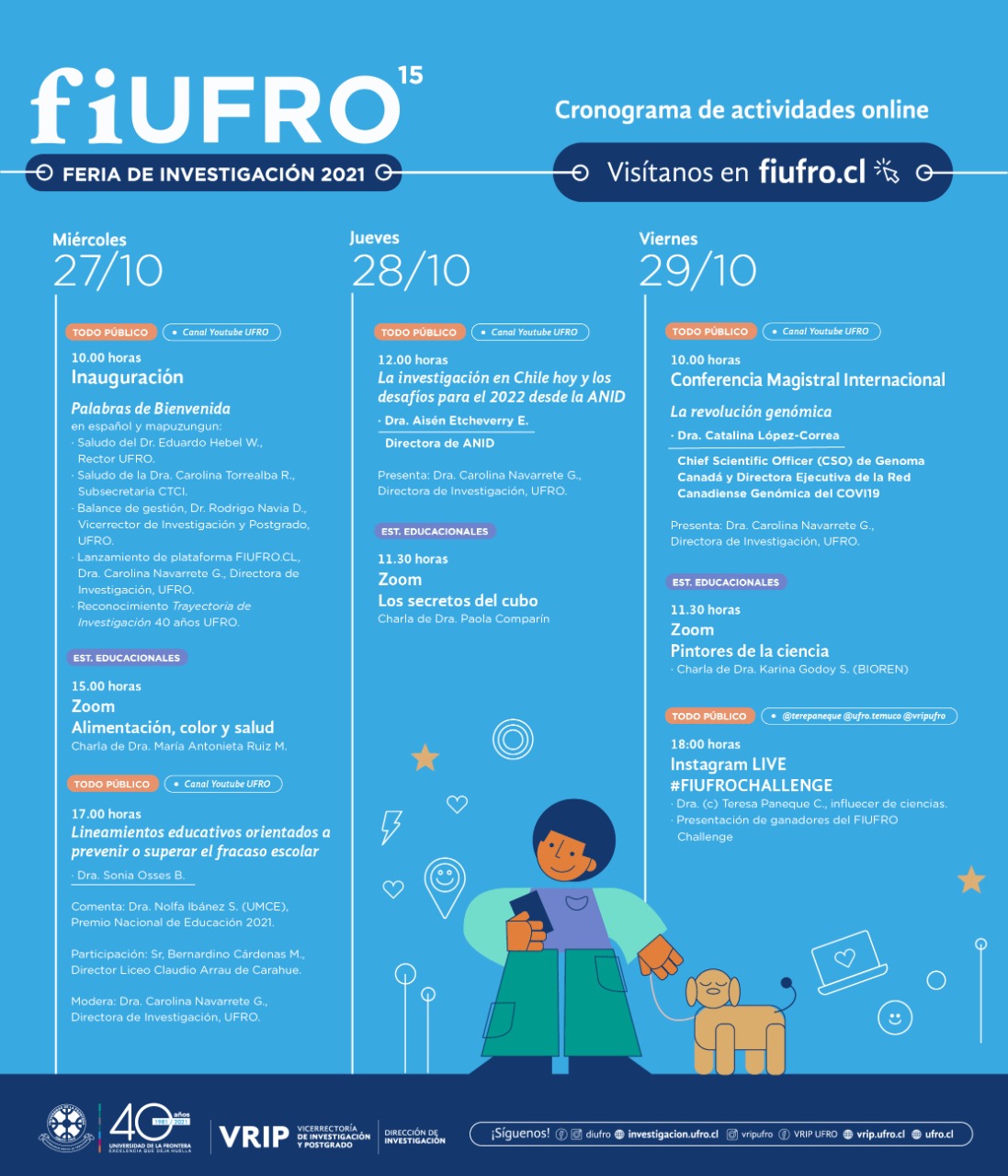 La inauguración de la FIUFRO 2021 se realizará el miércoles 27 de octubre a las 10.00 horas, a través del canal UFROVISION. Participarán las autoridades universitarias, encabezadas por el Rector, Dr. Eduardo Hebel Weiss; el Vicerrector de Investigación y Postgrado, Dr. Rodrigo Navia Diez; la Directora de Investigación, Dra. Carolina Navarrete González; y el saludo de la Subsecretaria del Ministerio de Ciencia, Tecnología, Conocimiento e Innovación, Carolina Torrealba Ruiz -Tagle.