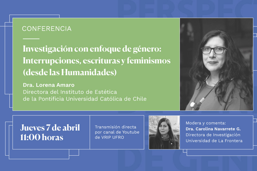 La conferencia de apertura de este I Seminario, se titula: Investigación con Enfoque de Género: Interrupciones, Escrituras y Feminismos (desde las Humanidades), expuesta por la reconocida académica Dra. Lorena Amaro, Directora del Instituto de Estética de la Pontificia Universidad Católica de Chile e investigadora Plataforma Interdisciplinaria Normalidad, Diferencia y Educación. La conferencia se llevará a cabo el jueves 7 de abril de 2022 a las 11:00 horas, y será transmitida en directo por el canal de Youtube oficial de VRIP UFRO.