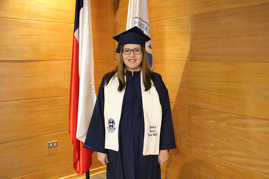 Su defensa de tesis y doble graduación se realizó en un solo acto solemne en la Universidad de La Frontera, donde participó una comisión internacional, conformada por un representante de la institución española, una veedora internacional, el director del Doctorado, académicos nacionales e internacionales del programa, además de quienes fueron sus profesoras guías en la UFRO y en la Universidad de Granada, esta última desde videoconferencia.