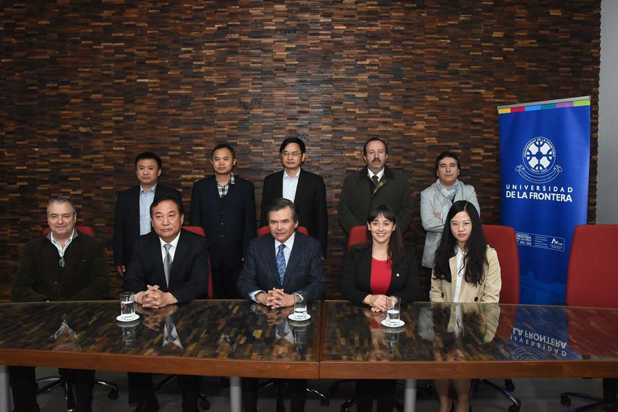 El encuentro fue realizado junto a los profesores Xidong Wu, Xiaodong Xie, Hongtao Chen, Ming Yin , junto al Rector Sergio Bravo, el Decano de la Facultad de Ciencias Agropecuarias y Forestales, Rodolfo Pihán, el Vicedecano de la misma Facultad, Dr. Adison Altamirano, el Dr. Francisco Matus y la Directora de Cooperación Internacional, Dra. Pamela Leal.