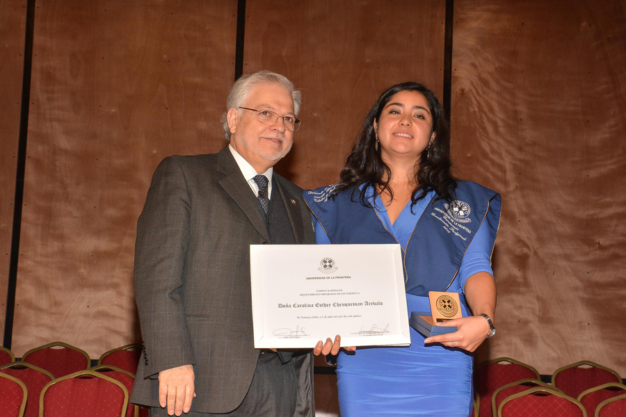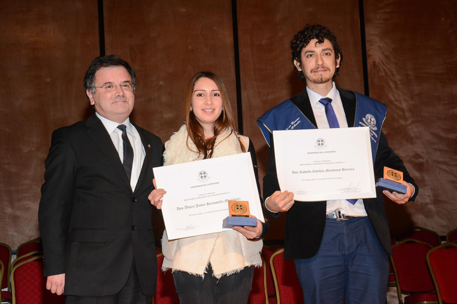En el marco de esta ceremonia se premió la excelencia con la entrega del premio mejor egresado teniendo en cuenta a aquellos graduados que lograron un destacado desempeño académico durante su permanencia en el programa. Este año el reconocimiento recayó en la Doctora Carolina Cheuquemán, el Magíster Rodolfo Mardones y el Magíster Álvaro Hermosilla.